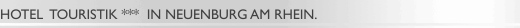 - Herzlich Willkommen auf unserer Homepage! - Welcome to our Homepage! BASLERSTR. 2 79395 NEUENBURG am RHEIN Telefon: +49 (0)7631 7876 E-Mail: info@hoteltouristik.eu Kurz und Bündig: - *** 3 STERNE HOTEL *** 3 STARS HOTEL *** - Schnelle Autobahnanbindung (A5 in Deutschland und A 36 in Frankreich) - fast highway access (A5 Germany and A36 France) - kostenlose Auto-, Fahrrad- und Motorrad- Stellplätze - free car, motorcycle and bicycle parking lots - Zentrale und Ruhige Lage - central and quiet location - Frühstück ab 7:00 Uhr - breakfast from 7 am - Alle Zimmer mit Dusche, WC, LCD TV und kostenfreien W-LAN (Wi-Fi) - all rooms with shower, WC, LCD-TV and free WIFI - Check in after 10:00 PM possibile (plase contact us) - Zimmer und Frühstücksraum voll klimatisiert (AC) - all rooms and breakfast room with air condition - for your security we have one Video Security System Inventar und Bäder sämtlicher 16 Zimmer wurden komplett erneuert. Seitdem bietet Ihnen das Hotel rauchfreie, komfortable voll klimatisierte Zimmer mit bis zu 5 Betten in funktionalem und modernem Design mit Flat-TV und . Inventory and bathrooms of all 16 rooms were completely renovated. | ![]() | |||||||||